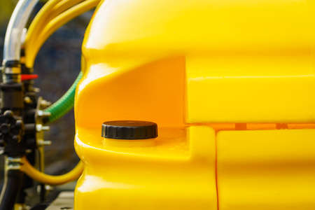 Truck diesel fuel tank. Big yellow color cantainer, detail of heavy machine, industrial or agricultural machinery.