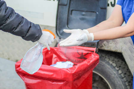 Used medical gloves and sponges after mobile phones sanitation, disinfection of items of frequent use