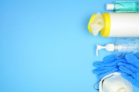 Coronavirus prevention. Flat lay medical surgical mask, hand sanitizer gel, gloves and glasses for hygiene covid-19 on blue background. Copy space.