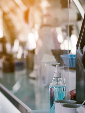 Blue alcohol gel bottle for hand cleaning to prevent the spreading of the Coronavirus (Covid-19) on counter to service for customers at cafe or coffee shop. Healthcare concept. New normal lifestyle.