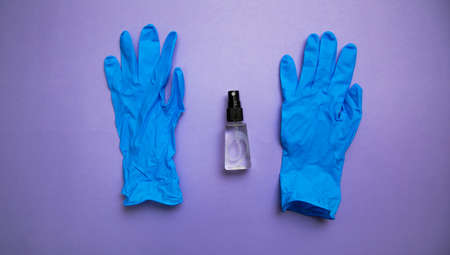 Hand in a medical glove holds an antiseptic for the treatment of hands on a blue background. Safety. The concept of viruses.