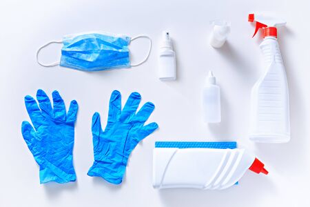 Virus protection equipment, medical gloves, medical protective mask and antiseptics spread out on a white background. Medical health protection.