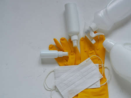 A set for disinfection on a white background. Gloves, mask, disinfectant. High quality photo