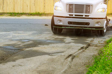 Cleaning sweeper machines washes asphalt road with water spray on the town.