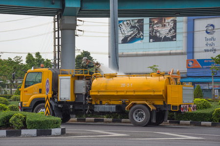 Bangkok, Thailand - May 28, 2016 : Unidentified Bangkok Metropolitan Administration worker working for watering the lawn on road by water tanker truck in Bangkok, Thailand.