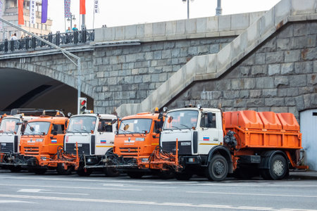 Moscow, Russia - October 19, 2019: Orange irrigation sweepers truck stand on the tram tracks. Moscow coat of arms. Cityscape.