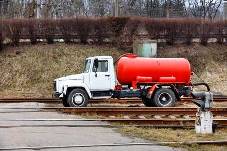 Sewage truck on pumping feces with a bright red cistern stands on the railroad tracks for disposal and cleaning at the rail road.