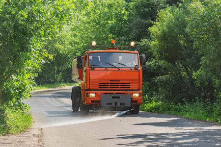 Watering the streets with an orange car with a tank, a hot summer day. The work of municipal equipment on city roads.