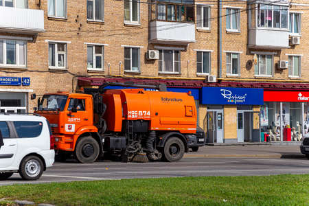 Sweeper machine on the road in the city (street sweeper). Community road services, street cleaning concept. Moscow, Russia