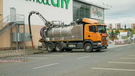 OLOMOUC, CZECH REPUBLIC, JUNE 29, 2020: Sewer cleaning tank truck car pipe drain cleaning shaft septic cesspool pumping suction hose under pressure, sump contains pollution sludge sewage wastewater