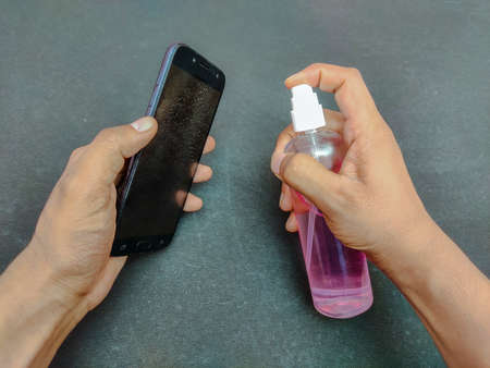 Covid-19 virus prevention, alcohol sanitizer in the hand are cleaning the smartphone for against infection,Corona virus.