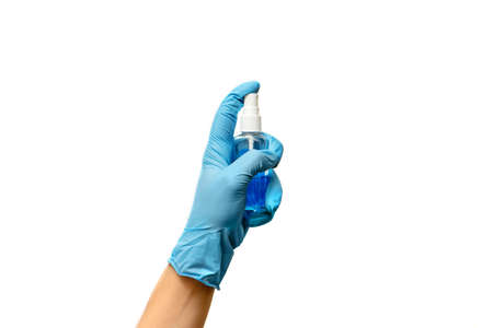 Man's hand with nitrile gloves for medicine using alcohol sprayer. isolated on white background.