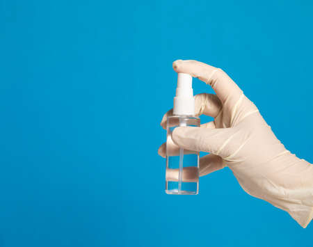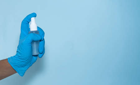 top view of a hand with medical gloves holding a small spray alcohol, blue background. Concept of coronavirus and self-care