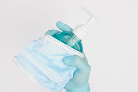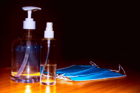 alcohol gel. Coronavirus prevention medical surgical masks and hand sanitizer gel for hygiene corona virus protection.