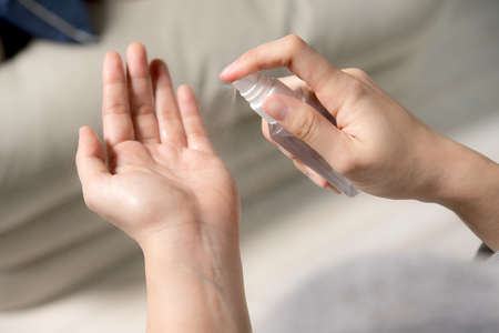Woman spraying hands with alhohol based hand sanitizer to kill viruses and bacteria
