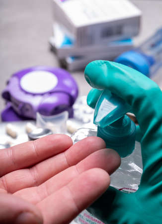 doctor hand in latex gloves holding hand sanitizer