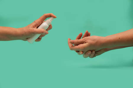 Hands sanitizer spraying on other person hands by spray bottle and pouring disinfecting alcohol gel to palm of other person hand to prevent from covid-19.