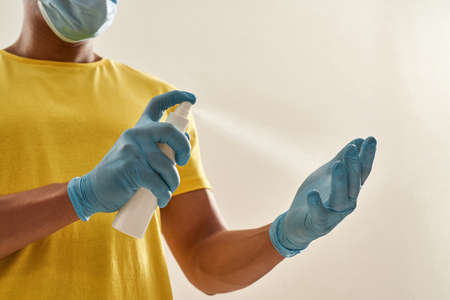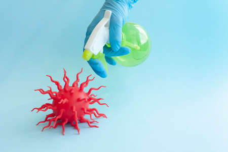 Hand in protective glove uses a disinfectant spray to kill coronavirus. Self protection during quarantine. Sanitize your hands and take care of your health.