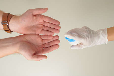 Close-up of a man giving hand sanitizer to a woman wearing gloves