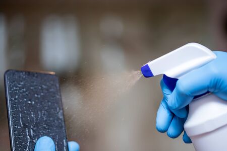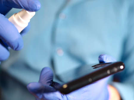 Person in gloves treats smartphone with disinfectant closeup