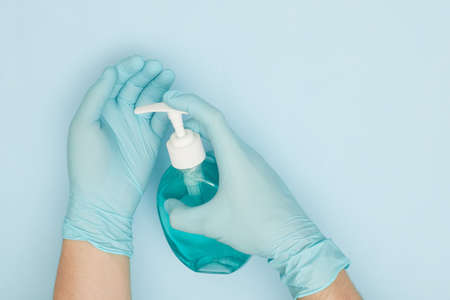 A man in blue protective glove holds a bottle with a disinfectant. Protection from bacteria and viruses.