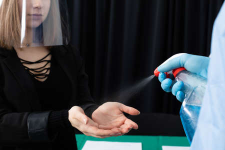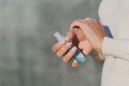 Girl cleans her hands with sprey antiseptic. Disinfection to hands for stop pandemic of virus