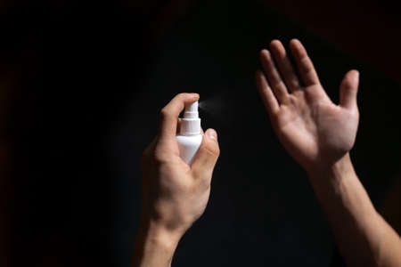 Human hand spraying sanitizer over black background