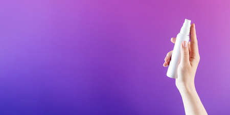 close up woman handing small spray bottle and spraying on dark background