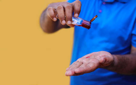 Man pouring massage aroma oil on hands