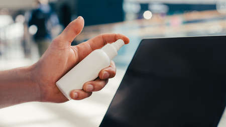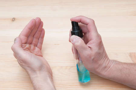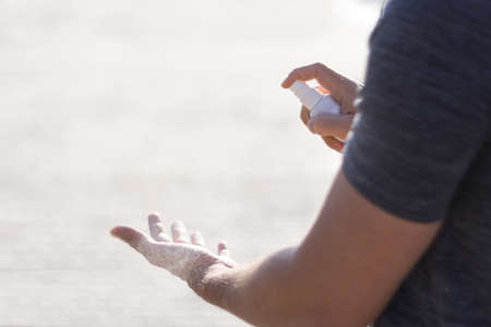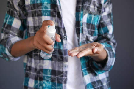 close up of young man hand using hand sanitizer spray.
