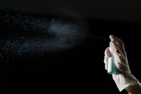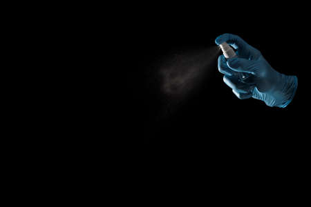 hand in gloves spraying antibacterial disinfectant to avoid virus isolated on black background