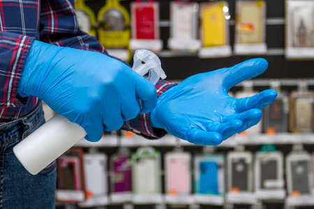 Man in blue protective gloves disinfects his hands in the accessories store. Protection from bacteria and viruses.