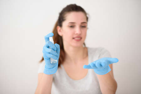 Close-up of an office worker girl in a medical mask and sprinkles an antiseptic on gloves in order to prevent disease by diseases on a gray background