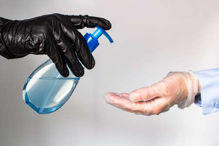 Antiseptic in the hands of man. Hand cleaning fluid. Hands of a man in gloves. Concept - office treatment by a sanitizer. Clearing rooms from bacteria. Concept - cleaning with an antiseptic.