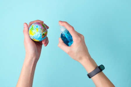 Hands holding a globe and disinfected with an antiseptic on blue background.