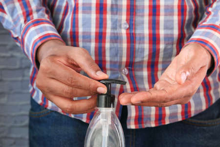 Man disinfecting his hands with blue hand sanitizer from a bottle on brick background