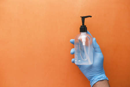 Hand sanitizer bottle in gloved hand closeup. Stop virus concept, new rules of life. Using antibacterial gel for hands during quarantine. Copy space