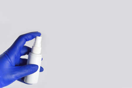 A hand in rubber glove hold the bottle of antiseptic spray. Protection concept