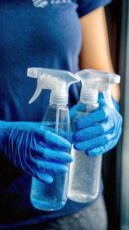 A person, wearing blue gloves, holds two spray bottles. One bottle contains blue liquid and the other purple liquid. The setting appears clean and organized..