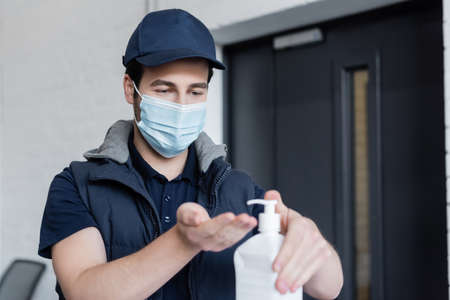 Delivery man in medical mask applying blurred hand sanitizer in office