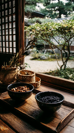 Bowls of nuts on a wooden table in a Japanese garden