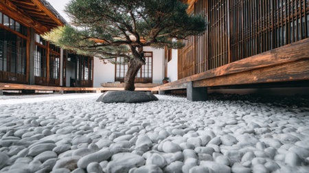 A serene Zen garden featuring a bonsai tree amidst a layer of white pebbles, framed by traditional Asian architecture, creating a peaceful and harmonious atmosphere.