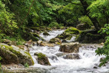 A waterfall flowing in the middle of rocky mountains in Sandankyo gorge, Japan