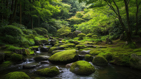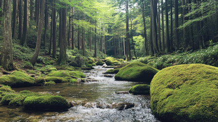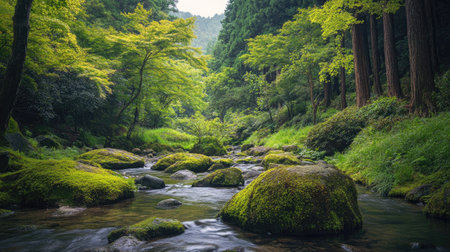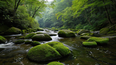 Serene forest river flows gently through moss covered boulders, surrounded by lush greenery and tall trees, creating tranquil and peaceful atmosphere in nature
