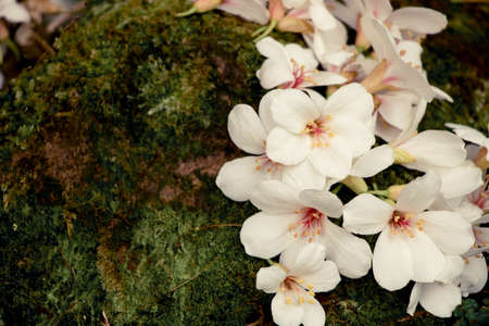 Mossy stones in a stream in the Japanese garden, close up