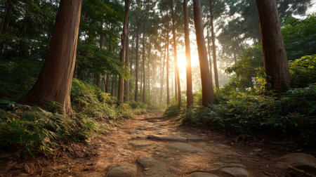 Sunlight breaks through the dense foliage in a serene forest setting, illuminating a rocky path, creating a peaceful atmosphere perfect for outdoor exploration.
