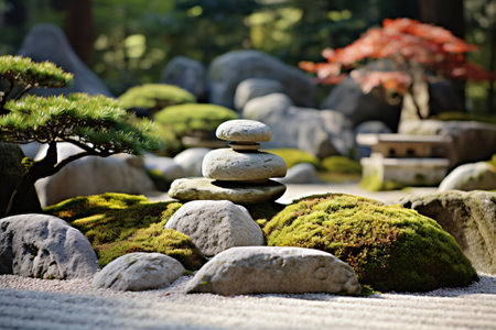 A serene rock garden with lush moss-covered rocks