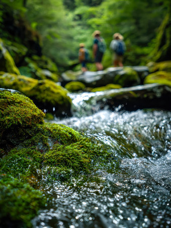 Adventurers navigate a verdant woodland, carefully stepping over a soft, mossy flow amid vivid foliage and dappled sunlight, embodied exploration and harmony with nature.
