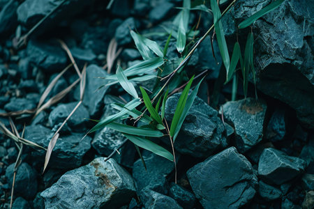 Green bamboo leaves on a dark stone background. Beautiful nature background.
