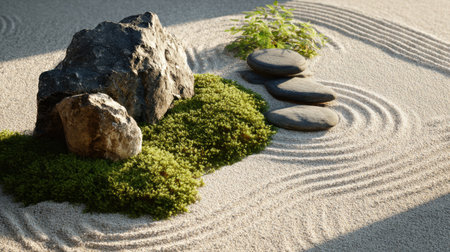 A tranquil zen garden featuring carefully placed rocks, flowing sand patterns, lush green moss, and smooth black stones, creating a perfect backdrop for relaxation and meditation.